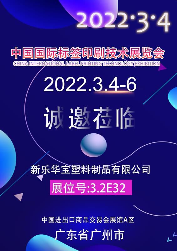 新樂華寶塑料制品有限公司2022年3月4日到6日亮相中國(guó)國(guó)際標(biāo)簽印刷技術(shù)展覽會(huì) 上一個(gè):新樂華寶塑料制品有限公司于2022年6月1-3日跨境電商交易會(huì),誠(chéng)邀您的參加! 下一個(gè):新樂華寶塑料制品有限公司11月29日-12月01日亮相上海國(guó)際包裝制品與材料展覽會(huì)